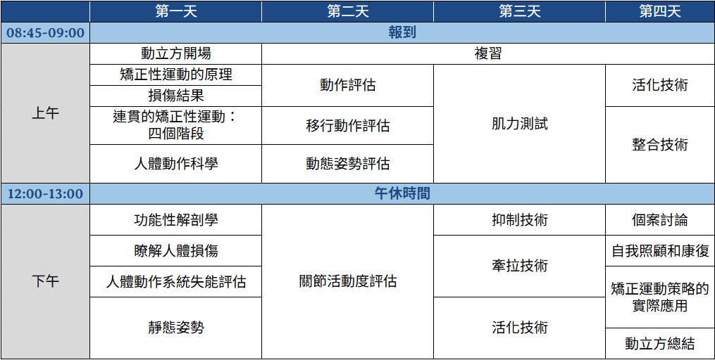 NASM在功能性運動和矯正性運動方面擁有最新、最傑出的研究,並開發了一套幫助教練們實際應用到各式各樣客戶身上的系統。運動矯正專家課程正是由NASM享譽全球的矯正運動連續階段(CEx,Corrective Exercise Continuum)所推動,其簡單而高效的四個階段:『抑制』、『牽拉』、『活化』與『整合』,將幫助您的客戶受到改善,進而矯正不論是訓練前還是訓練後頻繁的動作代償。